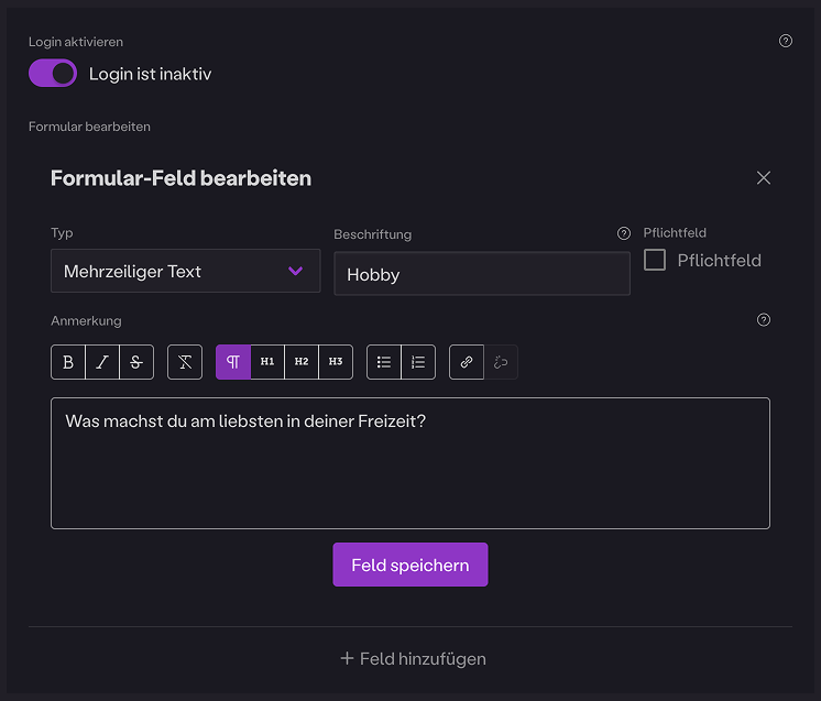 Wenn Login aktiv ist, kannst du das Formular um beliebige weitere Felder ergänzen — z. B. Name, Adresse oder Freitext.