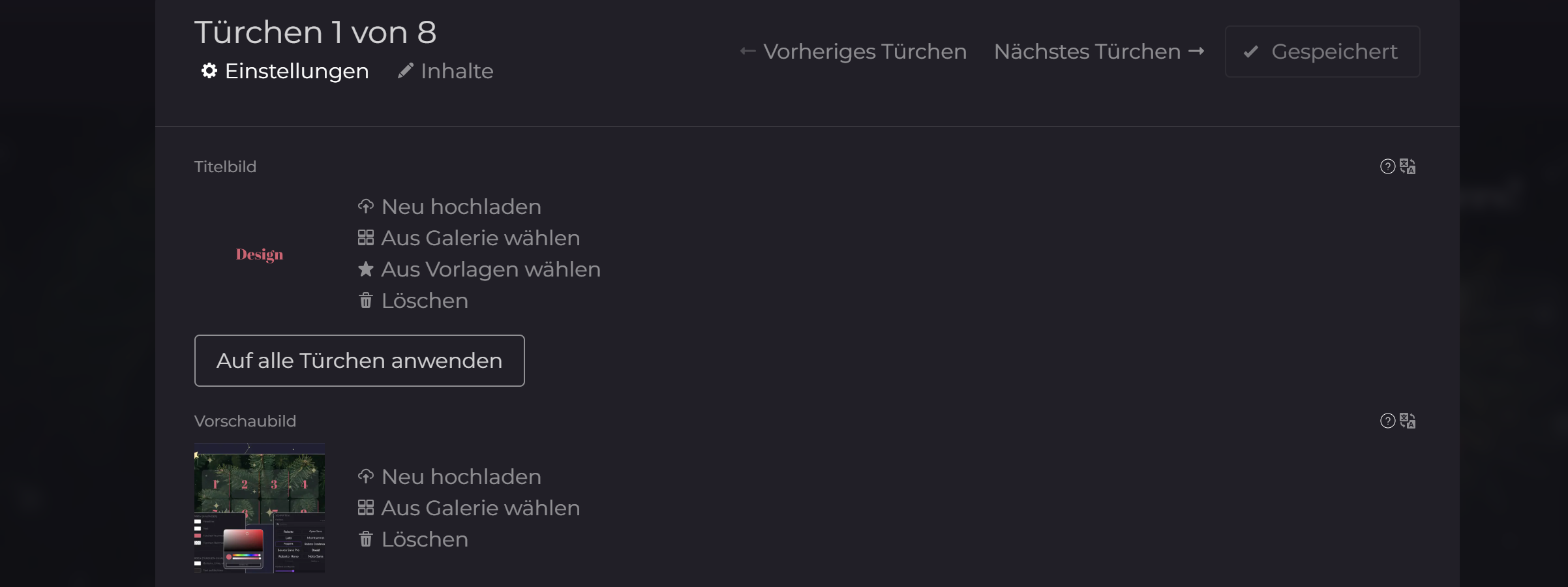 - Bild einfügen: Bearbeite dein Türchen, wechsle zu "Einstellungen" und lade dein Bild als "Titelbild" hoch. Hier kannst du übrigens auch das Vorschaubild anpassen, das hinter dem Türchen zu sehen ist, wenn es sich ein kleines bisschen öffnet.