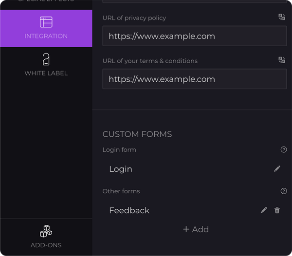 - Click on “+ Add” to create a new form and add specific fields (e.g., free text fields, checkboxes).