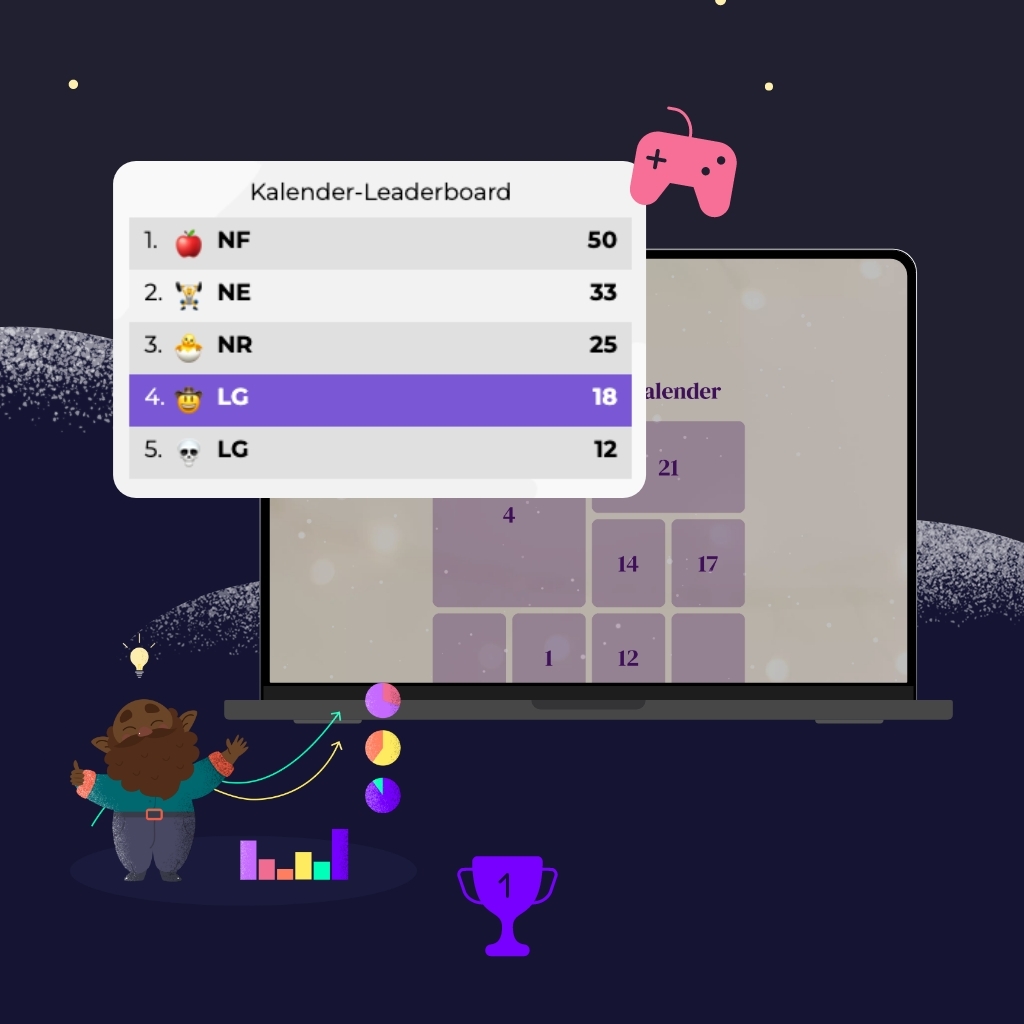 The leaderboard is the key to sustained motivation and a true sense of mastery. Here, the high scores of participants are recorded throughout the duration of the calendar, and they can see how they compare to other participants. And then it's in your hands to reward them with prizes.